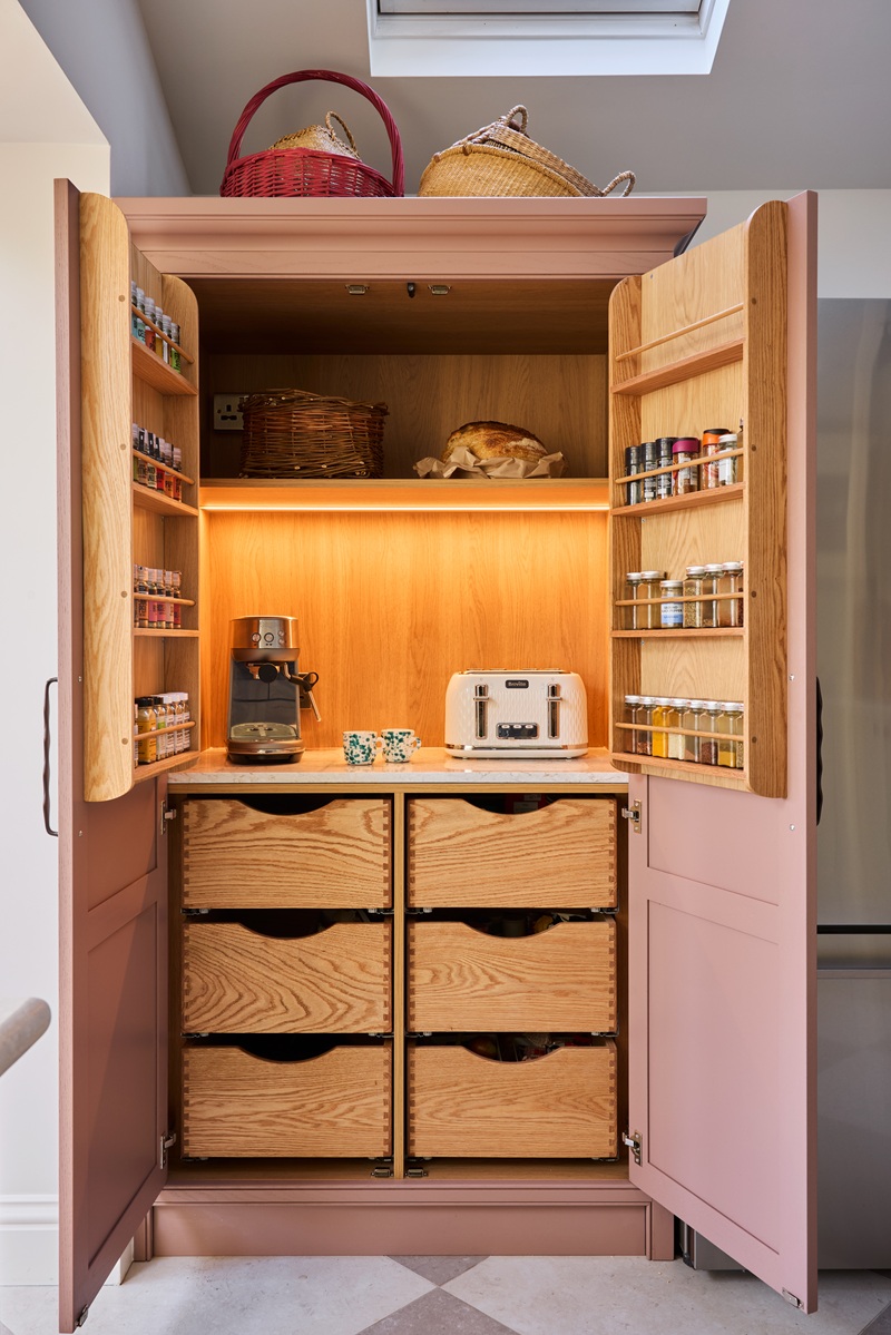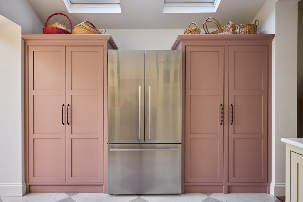 We wanted the hardworking larder and appliance cupboards to read as freestanding furniture pieces. The muted red-mauve undertone draws out the panel detailing and mouldings, while absorbing light with a sense of understated elegance.
