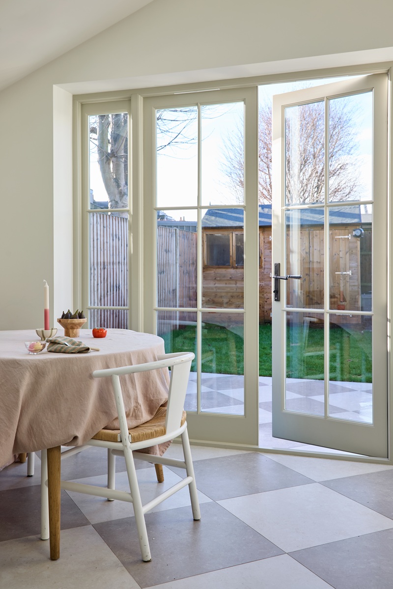 The soft chequered floor adds a touch of youthful whimsy. Laid diagonally, it optically widens the rectangular footprint and flows seamlessly out into the garden.