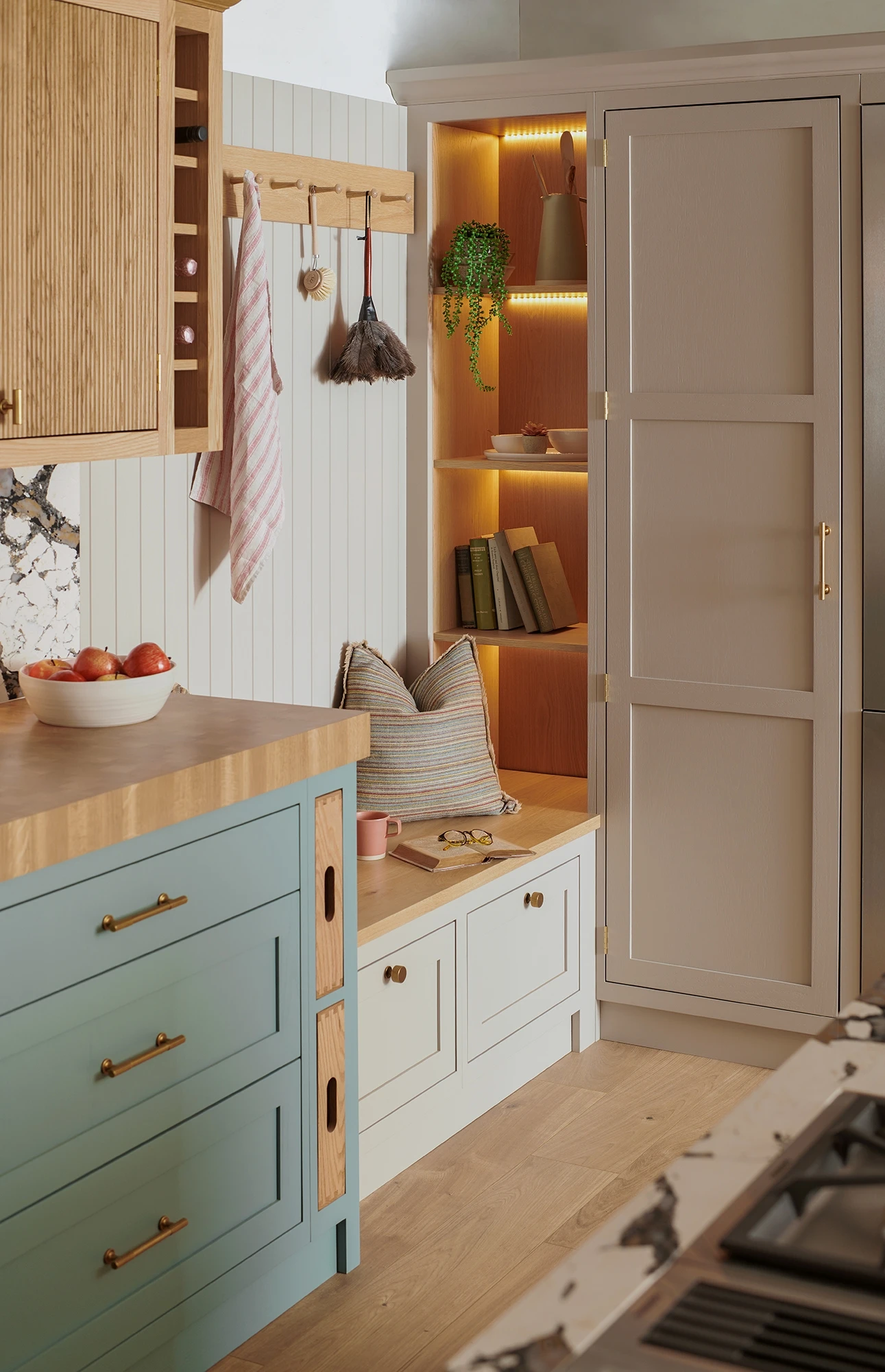 Few things are more inviting than a tucked-away seat. Window recesses, attic corners, utility niches, even the edge of a kitchen: all are natural alcove candidates. Add a padded bench, cushions and hidden storage beneath, and you’ve got a perch for coffee, a nook for reading, or a glass-of-wine spot while supper bubbles away. In our Elmham kitchen, a seating corner makes the alcove feel both useful and irresistibly cosy.