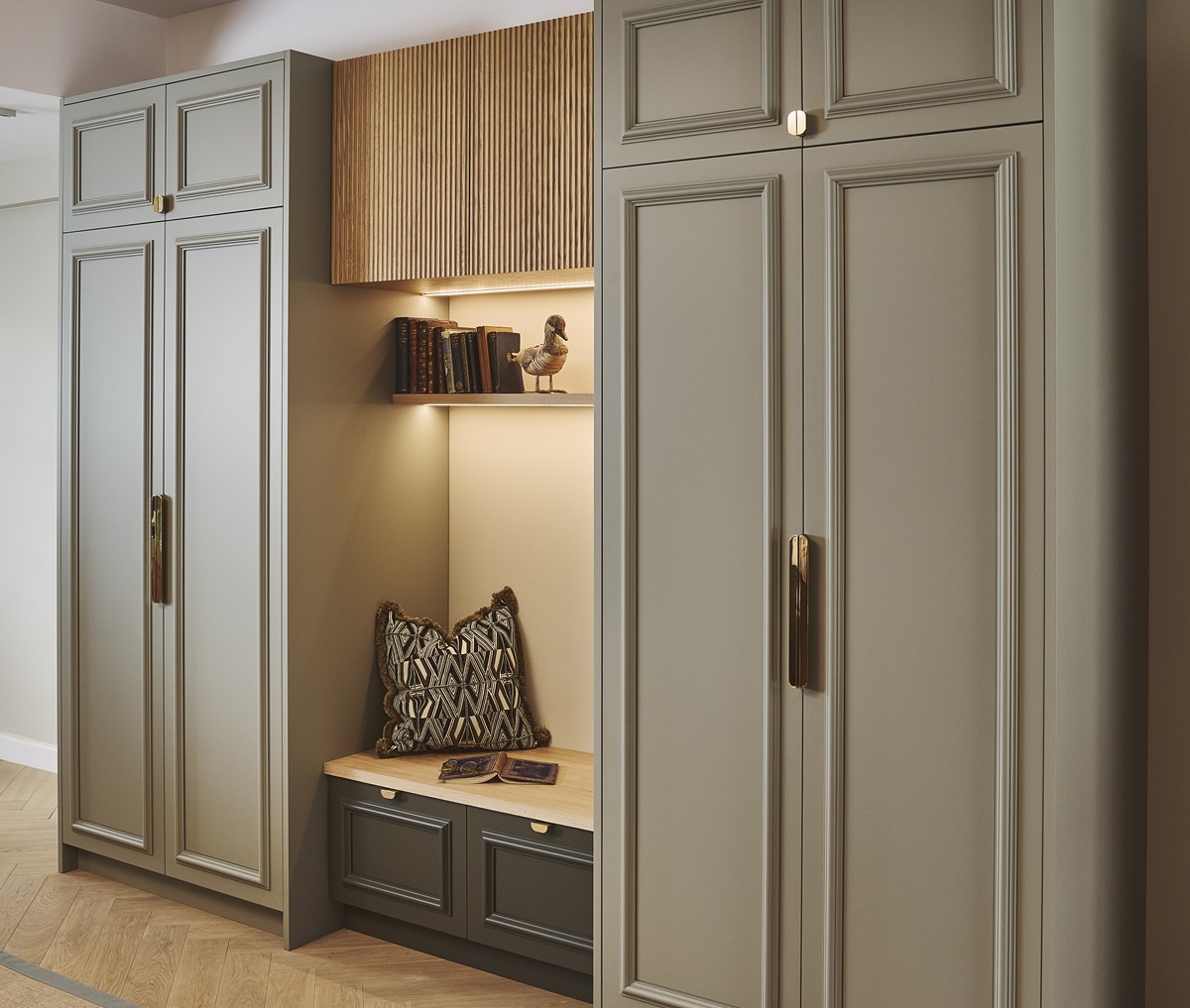 Hallways often bear the brunt of daily life — coats flung down, boots abandoned, bags piled up. A porch or hallway alcove can become a miniature boot room with the right joinery: low cubby holes, boot racks, hooks, overhead cupboards.