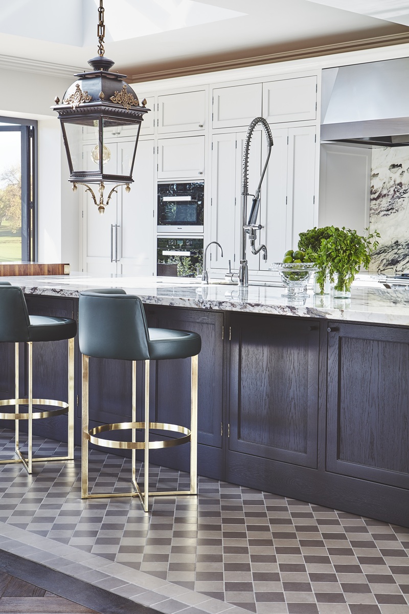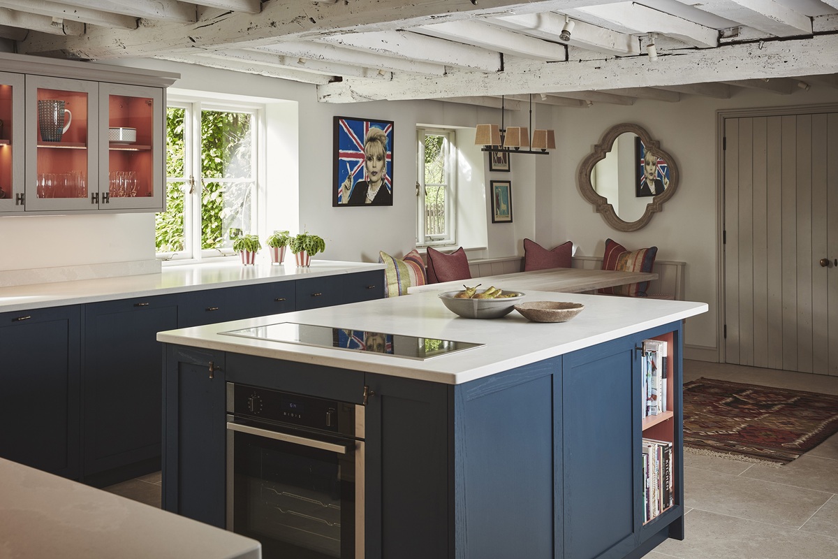 The Elmham kitchen, for example, combines calming light blue in-frame cabinets with reeded oak wine racks, quartz worktops and reeded glass island units – blending traditional craftsmanship with modern design details.