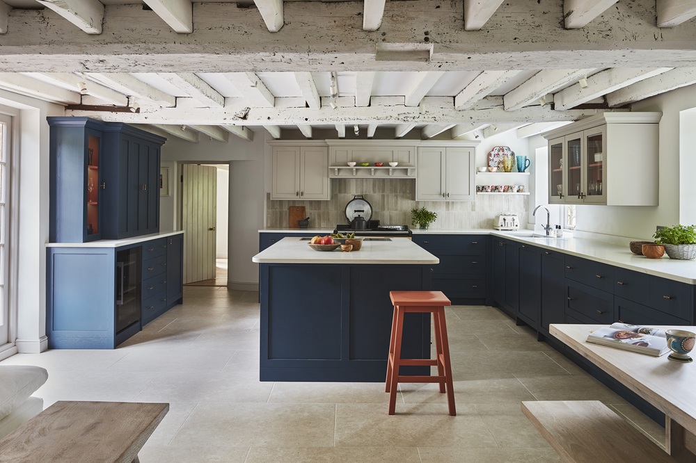 The Mill House kitchen, above, features whitewashed beams, ornate open shelving and glazed wall units in light grey Baked Cley – while rich Night Sky blue base units and a striking island add depth and modern edge to its rustic feel.
